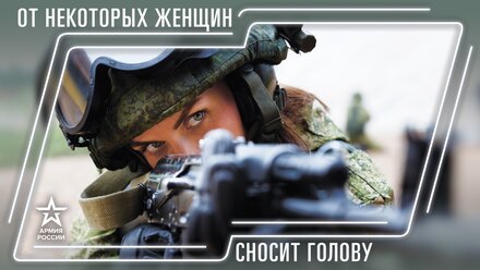 Сентябрь. Мы видим прекрасные глаза девушки-снайпера, которая целится, держа в руках автомат Калашникова. Текст "От некоторых женщин сносит голову"