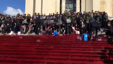 Французские экологические активисты провели в Париже экоакцию, во время которой вылили несколько сотен литров бутафорской крови, сообщают «Вести».