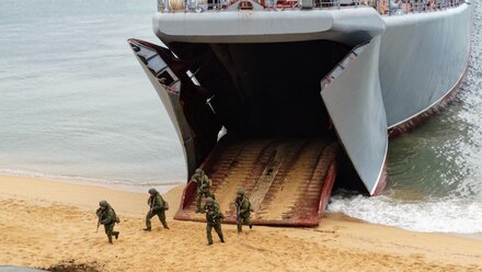 На втором этапе, прошедшем непосредственно на полигоне, морские пехотинцы под прикрытием армейской авиации Южного военного округа (ЮВО) осуществили погрузку на борт большого десантного корабля «Орск» и произвели высадку морского десанта на необорудованный участок побережья.