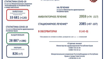 По данным ведомства, общее количество скончавшихся COVID-положительных пациентов достигло 826 человек. Всего с начала пандемии в Республике Крым зарегистрирован 33 681 случай коронавируса.