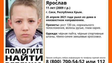В Крыму начались поиски 11-летнего Ярослава Шереметова. Об этом сообщает поисково-спасательный отряд Liza Alert.