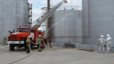 Четыре пожарных ствола ГПС-600 были поданы на тушение «горящего» резервуара, а девять стволов УРСК-70-15 — на охлаждение резервуаров с топливом. Условный пожар был успешно ликвидирован. В учении принимали участие 49 человек и 13 единиц техники.