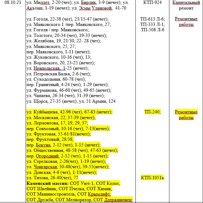 Так, согласно данным ГУП РК «Крымэнерго» с 8:00 до 17:00 будет происходить отключение электроэнергии последующим адресам: