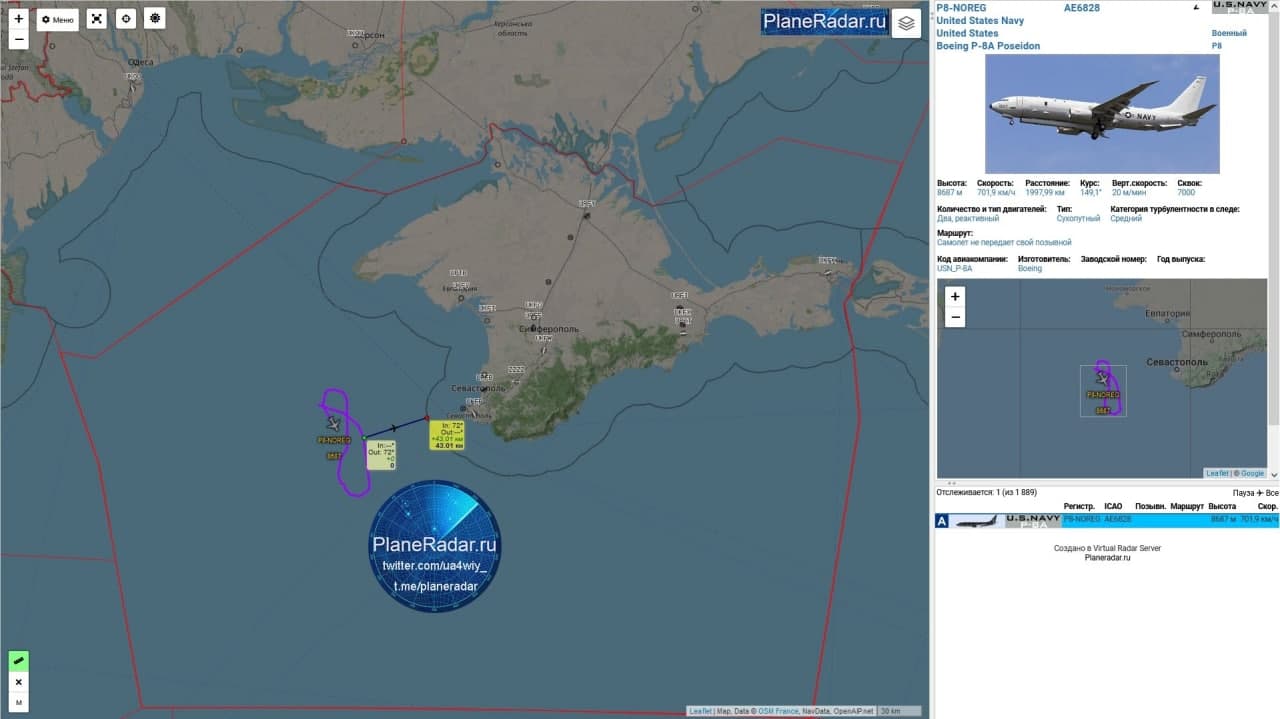 Патрульный противолодочный самолёт Boeing P-8A Poseidon, ВМС США шпионит у берегов Крыма. Судно было замечено в 15-10 по московском времени. Этому свидетельствуют данные мониторингового ресурса «Plane Radar», передаёт корреспондент «Вести Крым».