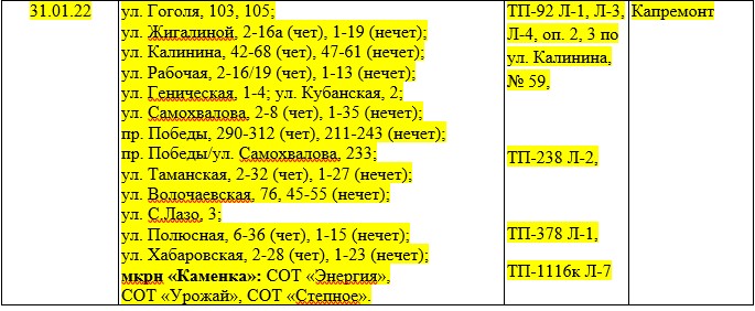 Электричество отключат из-за капитального ремонта подстанций с 08:00 до 17:00 по следующий адресам: