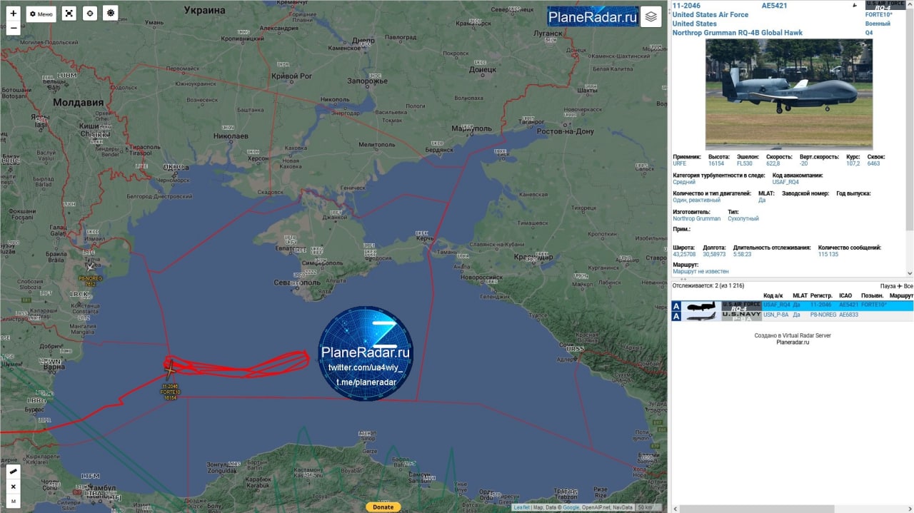 В акватории Черном море заметили американский беспилотник. Об этом сообщает сервис PlaneRadar, передает корреспондент «Вести Крым».