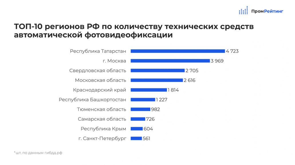 На первом месте рейтинга – Республика Татарстан. В регионе размещено 4 723 средства автоматической фото- видеофиксации нарушений ПДД. На втором месте – Москва (3 969 камер), на третьем – Свердловская область с 2 705 камерами на дорогах.