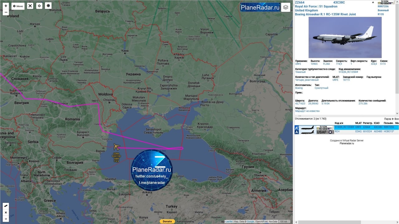 «По состоянию на 20:00 16 августа самолет радиоэлектронной разведки Boeing Airseeker R.1 RC-135W Rivet Joint, производит разведывательный полет у берегов Крыма», - говорится в сообщении.