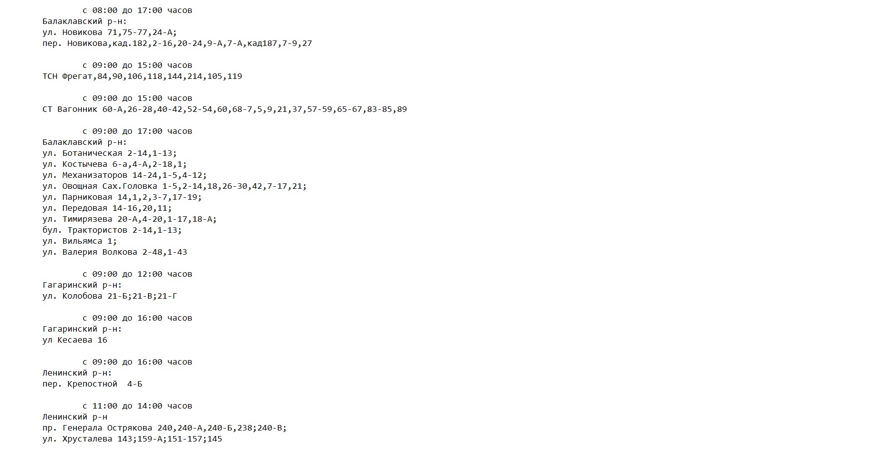 В связи с работами запланировано отключение электричества. Света не будет согласно следующему графику: