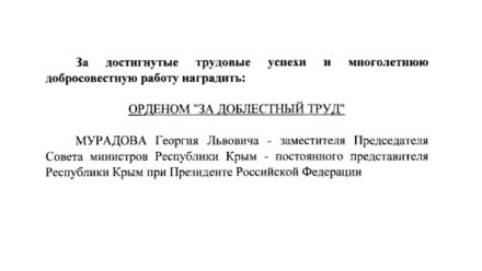 «За достигнутые трудовые успехи и многолетнюю добросовестную работу наградить орденом «За доблестный труд»: Мурадова Георгия Львовича - заместителя председателя совета министров республики Крым - постоянного представителя республики Крым при президенте Российской Федерации», - говорится в документе.