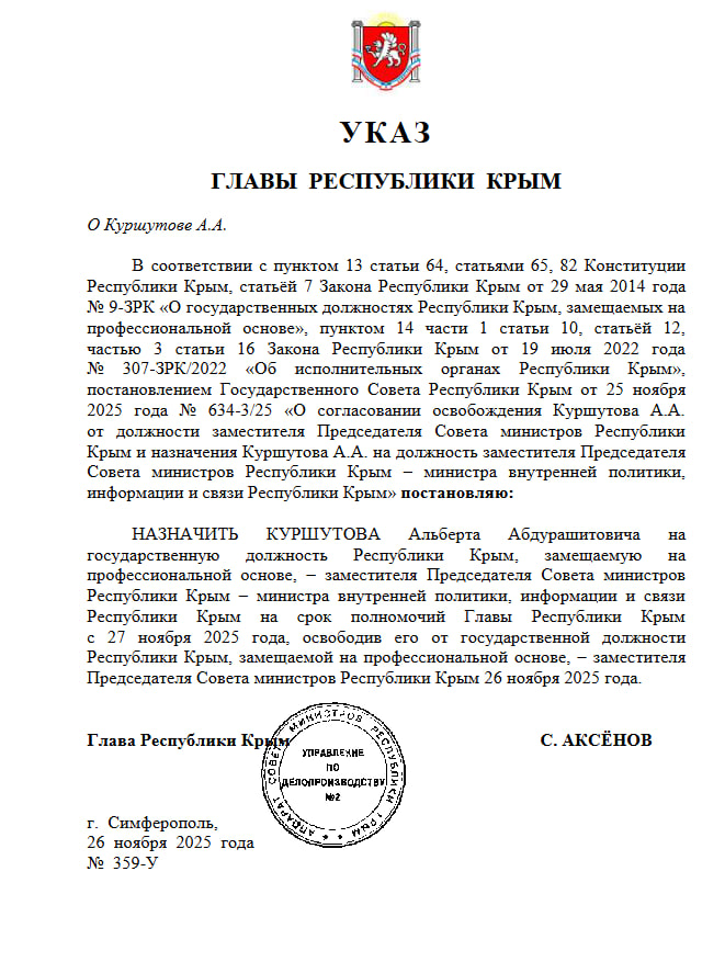 Вести КрымНовостиАльберт Куршутов назначен заместителем Председателя Совета министров Крыма – министром внутренней политики, информации и связи РК Альберт Куршутов назначен заместителем Председателя Совета министров Крыма – министром внутренней политики, информации и связи РК Соответствующий указ подписал Глава Крыма Сергей Аксёнов. 26 ноября в 10:43 260 Фото: Вести Крым Подписывайтесь на Вести Крым в Telegram, RuTube, Дзене, ВК и ОК. Общество Вести Крым в Telegram Вести Крым в MAX Читайте также