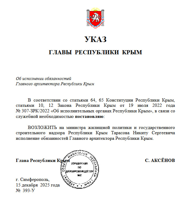 «Возложить на министра жилищной политики и государственного строительного надзора Республики Крым Тарасова Никиту Сергеевича исполнение обязанностей Главного архитектора Республики Крым», — говорится в документе.